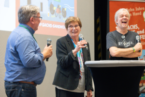 Nach dem festlichen Diner interviewten unsere Gründungsmitglieder Ralf Thees und Andreas Kemper einige Wegbegleiter der vergangenen zehn Jahre. Darunter Igor Kats, dessen Familie die erste von der Krankheit betroffene war, die sich kurz nach der Gründung unserem Verein anschloss. Oder Melanie Mende, die sich unmittelbar nach der Diagnose ihres Sohnes Ben bei uns meldete und uns seitdem auf vielfältige Weise unterstützt. Oder Dr. Laila Arash-Kaps, die seit unserer ersten Konferenz uns bei fast allen Konferenzen im In- und Ausland begleitete, unterstützte und beriet. Sonja Hasemann, die sich seit zwei Jahren um die stetig wachsende Gruppe der adulten Betroffenen kümmert und selbst Karin Sandhoff, die ihren Mann von Beginn an stets zu unseren Treffen begleitet, kam auf die Bühne. Sehr unterhaltsam schilderte sie, wie der junge Student Konrad